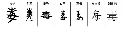 “毒”dú,会意字,本字作‘每’,从屮从母,“毒”字目前只见于秦简。屮,草木生长;母,妇人,已婚女子,造字本义:已婚女子头顶簪草(戴绿),喻义出轨,引申为‘害、伤害’,如毒性、毒药、毒蛇、荼毒等;引申为‘恨、怨恨’,如愤毒;引申为‘祸害’,如毒患、毒乱等。