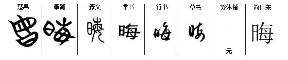 “晦”huì,形声字,从日从每,“晦”字最早见于楚系简帛。日,白天;每,此‘每’应为‘毒’,本义为出轨的妇人,引申为品行不端的人。造字本义:即使在白天,品行不端的人也会感觉压抑,引申为‘不顺、倒霉’,如晦气等;由‘即使在白天也感觉压抑’引申为‘昏暗’,如晦暗、晦涩等。
