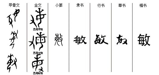 “敏”mǐn,形声字,从每从攴pū,“敏”字最早见于西周金文。攴(攵),手持棍;每,此‘每’应为‘毒’,本义为出轨的妇人,引申为品行不端的人。造字本义:持械捉坏人,‘捉坏人’除了持械还需要‘速度与智慧’才能捉住坏人,后引申为‘速度、智慧’。