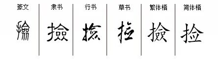 “捡”jiǎn,会意兼形声字,‘撿’的简体字,从扌从僉qiān,字最早见于《说文》小篆。扌,与手有关;僉,收缩、聚拢、约束。造字本义:以手指的聚拢抓取物体即为捡,表义抓取的汉字有很多,如抓、拘、捡、取等,有细微的差别,与意境、情境、地区有关。