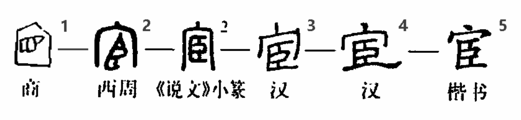 “宦”,会意字。徐中舒《甲骨文字典》据图1字形释为“宦”。这个字外部像宫室的轮廓,与“宀”表意相同,尽管它的下部是封闭的。内部是“目”,“目”“臣”最早为同一字,故此字当为“宦”字。金文作图2,小篆则由金文演变而来,隶书、楷书整齐化,由半包围结构变为上下结构。“宦”字由“宀”和“臣”组成,“宀”本指房屋,这里指官府;“臣”本像竖立的眼睛,后作为奴仆的代称,合起来的意思是:在官府里当奴仆。也有人理解为“宀”内有“臣”,其字形表示的意思是:在室内劳动且又听话的奴隶。顺从主子的奴隶才可以委以官职,所以“宦”字又用于指称小官吏。“宦”的造形,反映了古代选拔官吏不是任能为贤,而是任人为“亲”,专用听话的。