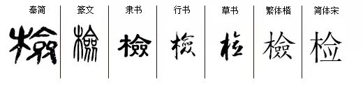 “检”jiǎn,会意兼形声字,通‘敛’,‘檢’的简体字,从木从僉,“檢”字目前只见于秦系简牍。木,与树木有关;僉,收缩、聚拢、约束。造字本义:木制书匣,用以收纳书、玉玺、虎符等贵重物品。继承‘僉’的‘约束’义,如检束(整顿好行装)、检敕(检点,整饬)、检邪(制止邪气)、检勒(检点约束)、检局(约束,节制);由‘收纳书’引申为‘翻阅、查阅’,如检书(翻阅书籍)、检卷(检阅文书案卷)。这是典型的按着新事物造字,引申义跳跃性大,略显牵强,但,也正是由于造字者的大胆尝试,扩充了汉字的抽象义,形成了博大精深的汉字文化。