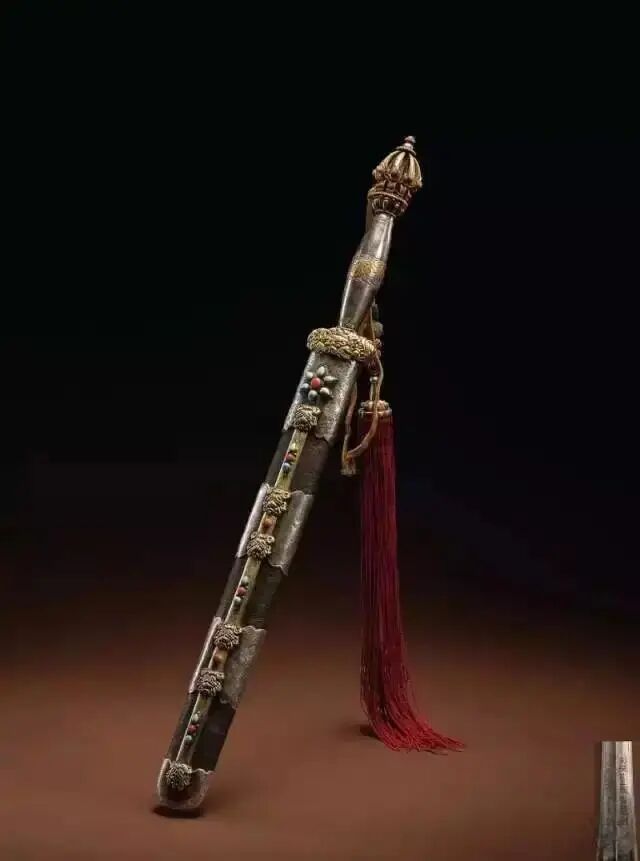 刀与剑在清代的地位极不相同,刀仍是清军的主要格斗兵器,同时作为皇室、官佐的佩刀,而剑已极少装备军队,只作为皇室贵族的玩物。刀有长柄、短柄之分,长柄刀军中已不多用,形制仿明。短柄刀的种类却很多,按其作用有三大类:一为兵卒用刀,有双手握柄劈砍的大刀,刀刃宽大厚重;有单手砍刺之短刀,与藤牌配合使用,刃较锐尖,以利刺割。二为官佐佩刀,形制与明代有异,其钢刃较窄薄,刃上有血槽,前部微曲,尖锐而锋利,刀柄作弓曲弧形,有鞘,此种腰刀各省官佐一律佩用。三为皇室宝刀,其形与官佐佩刀大同小异,但制作却异常精美,尤以乾隆御制宝刀、宝剑最为著名。乾隆帝曾四次命内务府造办处成批制作御用刀剑,共计90把。刀剑用宿铁制成,刃部近格处用金、银、铜丝镶嵌成龙、凤、云、水等各种图案及刀剑的名称、编号、年款;护手金制,镶红宝石、珍珠等;柄用木制,缠黄丝带,或用白玉、青玉、墨玉等整块玉石琢刻而成,镶有各种宝石;鞘为木质,蒙红、绿鲨鱼皮,或用金桃皮拼组成“人”字图案;刀剑按名号分组放入楠木箱中。这些造型古雅庄重、装饰华丽斑斓的御用刀剑,经常在大阅庆典、秋弥隆礼、巡幸省方、命将出征及款洽外藩等重要场合使用,虽历时200余年,至今仍尖锐锋利,寒气逼人,实是清代兵器中的瑰宝。