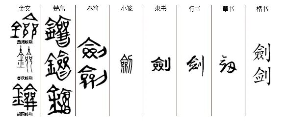 “剑”jiàn,会意兼形声字,本作‘鐱’,从金从僉qiān,古文有‘劎、劒、劔’等写法,秦朝开始写作‘劍’,“鐱”字最早见于西周金文。‘劍’相较其它字形更为贴切,从僉从刂,僉,收缩、聚拢;刂,与刀有关。造字本义:一种似刀,刀身皆磨(收缩)成刃的兵器。