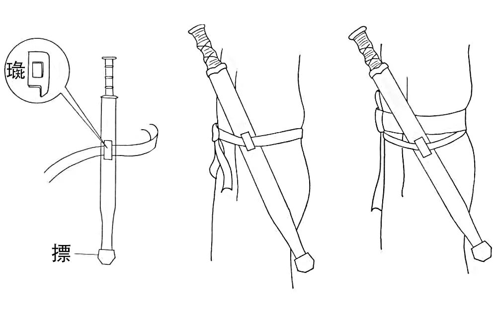剑作为兵器的便利之处不仅在于可击可刺,还在于它可以随身佩带,而不妨碍其他活动。东周时期,中原地区都采用以璏贯带、以带将剑系束于左侧腰间的“璏式佩剑法”。璏即剑鞘上贯带的装置。这种方法春秋初期即已出现,之后一直沿用到南北朝时期。