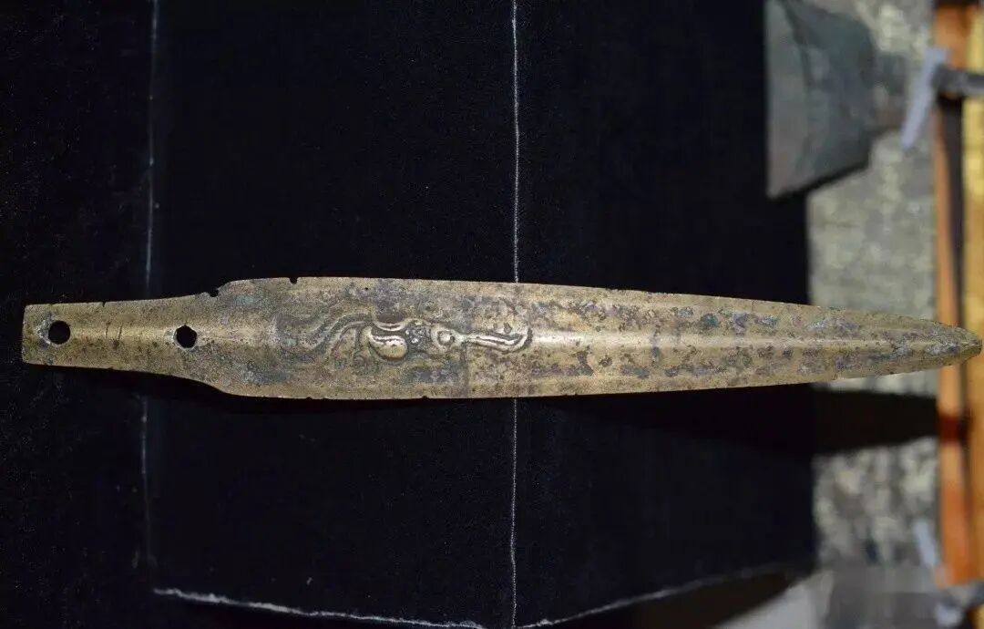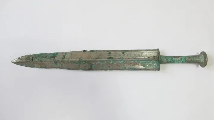 关于西周时期的剑,以前还存在一种传世品,其特点是扁茎两面都有凹槽,剑身基部饰人头纹,装柄方式可能与扁茎柳叶形剑相似。此种剑近年在陕西和江苏出土了实物,可以认为是一种早期青铜剑。