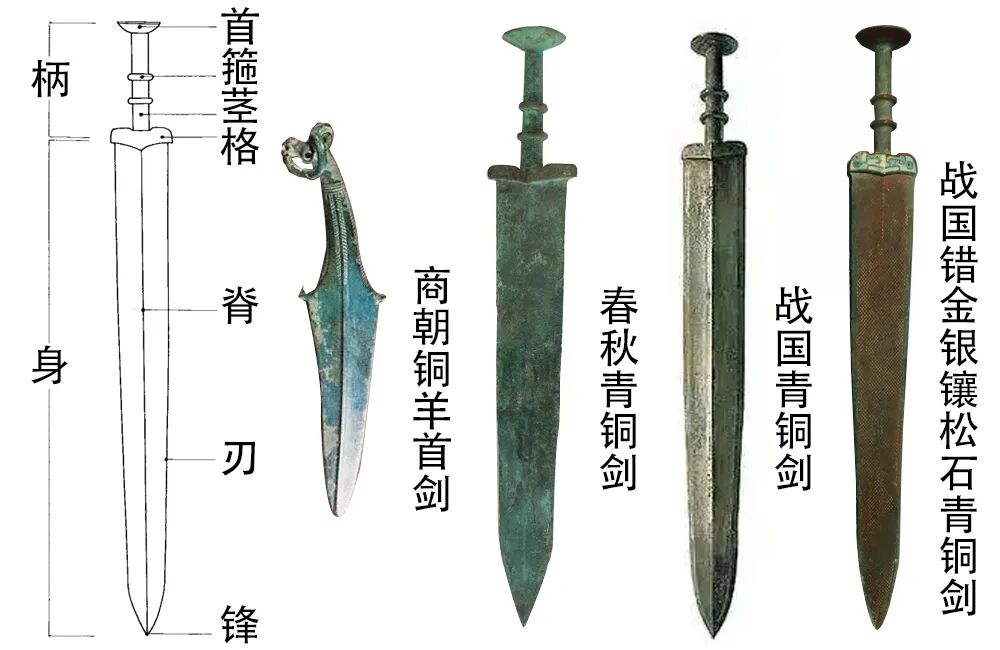 剑是中国古代一种重要的冷兵器,其形制特点是:直身、尖锋、两刃,后接短柄,并常配有剑鞘。一般单手握持,主于击刺,古人称之为“直兵”。