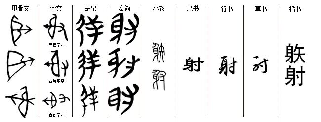 “射”shè yè yì,本为象形字,同‘䠶’,‘射’字最早见于商代甲骨文。像矢(箭)在弓弦上将要发射之形。商朝时期的‘射’字像弓上注箭形。西周文字或作一‘手’(又)拉弓射箭形。战国时期‘射’字形变,‘弓’、‘矢’二者不再互相配合为象形字,而是相并立;‘弓’不再用象形字,改为简省形并且成为偏旁;‘矢’字倒书并加短横,或虽正书而形变较大。秦简中‘弓’又被讹作‘身’,‘又’则被加一短划成为‘寸’,至此,‘射’字从身从寸。汉代隶书、《说文》小篆显然受秦文字的影响而定型。造字本义:弓上注箭,即将发出,引申为‘用推力或弹力送出子弹’,如射击、扫射、发射、射程、射手等;引申为‘气体或液体等受到压力迅速流出’,如喷射、注射等;引申为‘指向’,如暗射、影射等。
