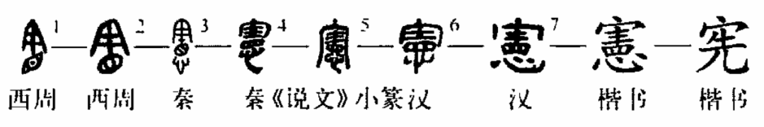 (xiàn)《唐韵》《集韵》《韵会》许建切,音献。悬法示人曰宪。从害省,从心从目。观於法象,使人晓然知不善之害。接於目,怵於心,凛乎不可犯也。《周礼·天官·小宰》:宪禁于王宫。注:宪谓表县之,若今新有法令也。《诗·大雅》:文武是宪。笺:宪,表也,言为文武之表式也。因宪为表式之义,故人之取法,亦谓之宪。《书·说命》:惟圣时宪。传:宪,法也,言圣王法天,以立敎於下也。《礼·内则》:五帝宪。注:法其德行也。