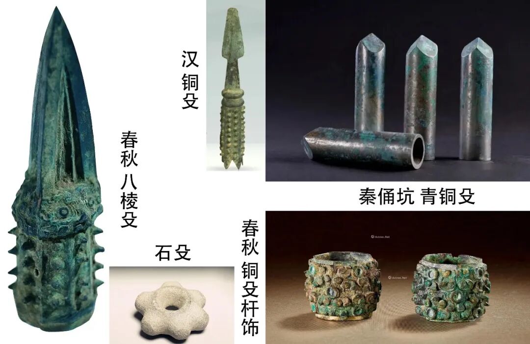 秦殳形制较简单,是一个铜圆筒,顶部呈三棱锥形,无利刃,下接长柄,显然这样的兵器不大利于实战,主要是作为仪仗队的礼兵使用。在秦俑三号坑中曾成批出土了铜殳,据考证,三号坑是指挥坑,而手执铜殳的武士俑正是担任警卫职务的殳仗队。