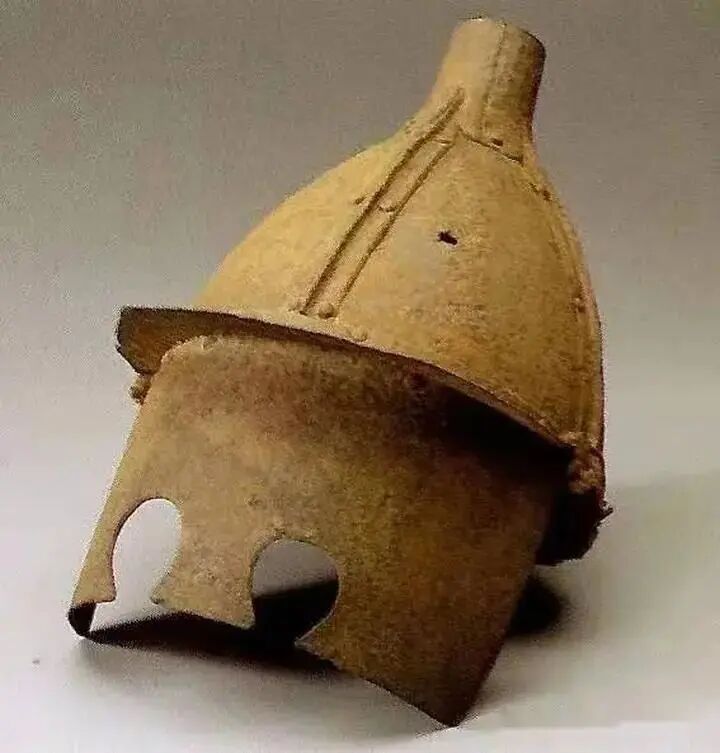 西周时期主要使用皮革制作的甲和冑,并在皮质甲冑上钉缀青铜饰件,以增强防护效能。现今发现的西周铜甲饰大多呈圆泡形,出土时背面常粘有皮革残迹,周边还有漆痕,说明当时的皮甲是经过髹漆的。此外,西周时期也已出现用众多青铜甲片联缀而成的青铜铠甲。此时期的青铜冑目前只在中原北部有所发现,形制与殷代不同,可能受到北方游牧民族风格的影响。