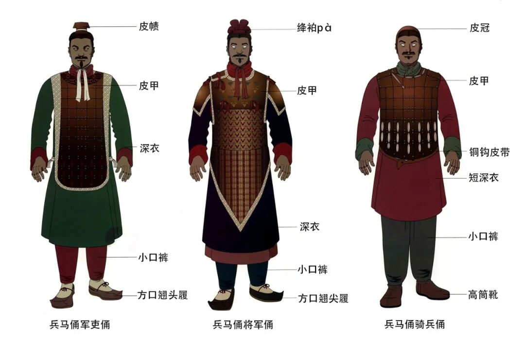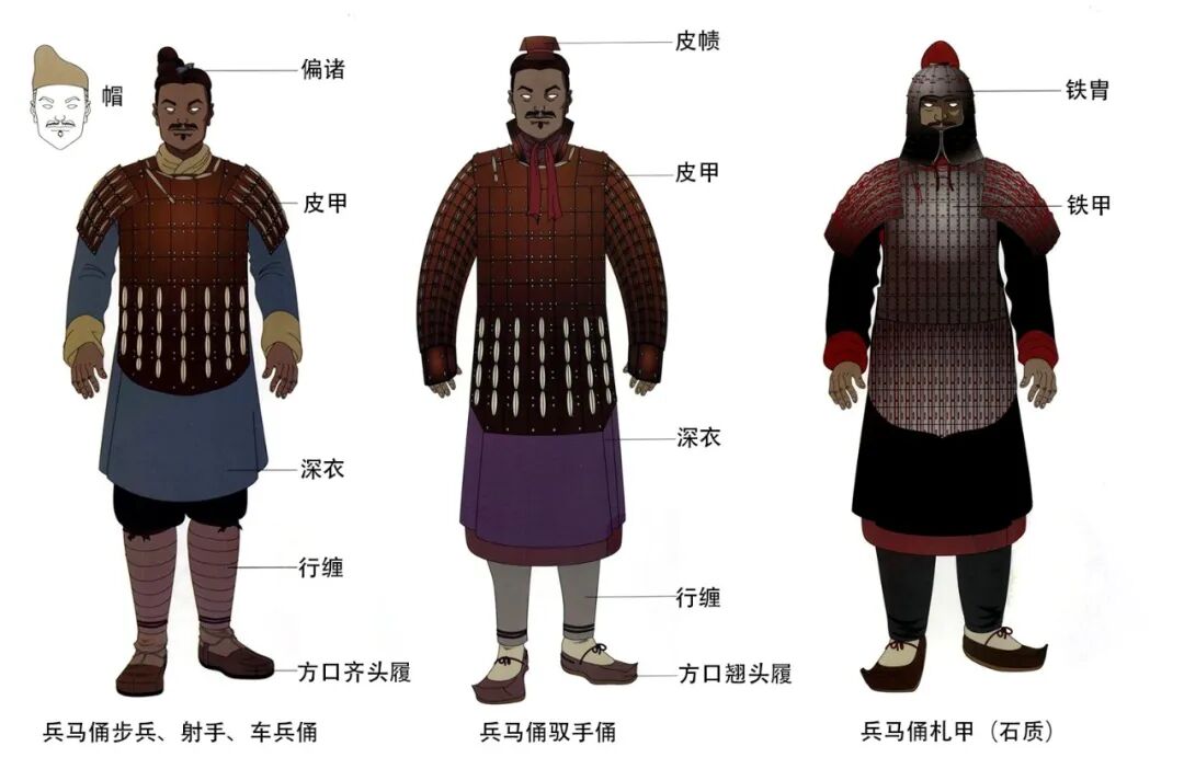 秦兵马俑坑出土武士俑所着的铠甲,是模拟当时实用甲衣雕塑的,表现细腻、准确。由此可以看出,秦甲结构精密,甲衣的形制和编缀方法已形成一套制度,大体可分为两大类:第一类是由整片皮革或其他材料制成护甲,在它上面再嵌缀甲片,四周留有宽缘,甲片有可能是金属的,这类甲出土很少,看来是将佐使用的;第二类全由甲片编缀而成,甲片较厚,似为皮甲,这类甲出土很多,是秦军士兵的主要防护装具,它们又可分为步兵甲、骑兵甲、御者甲等。两类铠甲全系上甲衣,综合起来由前甲(护胸)、后甲(护背腰)、披膊(护肩)、盆领(护颈顶)、臂甲和手甲几部分组成,不过因兵种及身份的不同而甲衣的形制有别。如骑兵的铠甲较短,是为了乘马方便;战车御手的铠甲甲身很长,并编缀有长长的护臂甲和护手甲,是为了有效地防护;将佐的铠甲则是甲衣上嵌缀甲片,双层防护,甲片小而密,护甲宽边上多施彩绘图案。将士披挂甲衣时,在内要著战袍,此外还要围护颈的曲领,绑护腿的“行縢”(縢téng,裹腿),有的头上戴有长冠或巾帻(帻zé,古代汉族男子包裹鬓发、遮掩发髻的巾帕。),这些装束给人以勇健、精悍之感。