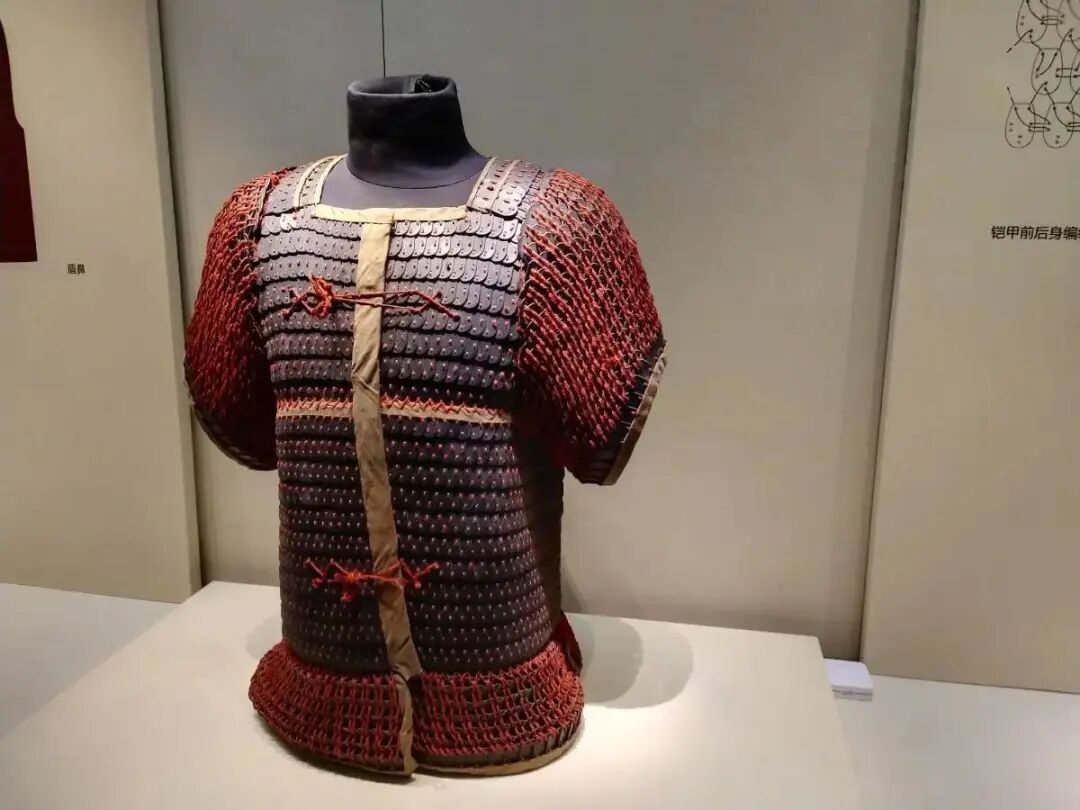 西汉编缀甲片通常是用麻绳,也有用皮条的。编缀的方法,一般是先横编后纵联,横编时是从中心一片向左、右编缀,纵联时则由上向下,所以铠甲片一般是上排压下排,前片压后片。根据部位不同,有两种编法,一般部位是纵横都固定编缀,但在特殊部位,如肩部、腰胯部等处,需要活动,则是采用活动编缀,即将编组的绳索留有可供上下活动的长度,使甲片可向上推移,伸缩自如。