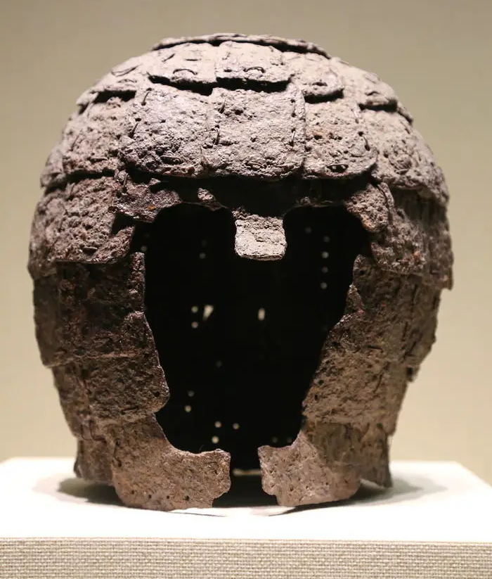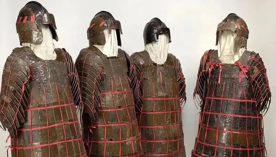 西汉时,铁制铠甲已成为军队中的主要装备,皮甲退居次要地位。从陕西咸阳杨家湾出土的披甲武士俑中,可以看到两种铠甲的样式,一种为札甲,采用长方形甲片,胸背两甲在肩部用带系连,有的还加披膊,为汉代铠甲的主要形式。另一种甲式比较少见,采用鱼鳞甲片(在腰部、肩部等活动部位,仍用札甲形式),穿这种甲者,身份比较显贵,应为当时的指挥人员。在河北满城西汉中山靖王刘胜墓中出土过一领铁鱼鳞甲,经复原后可以看出全由鱼鳞甲片组成,已没有札甲片,是当时王公贵族穿用的甲式。