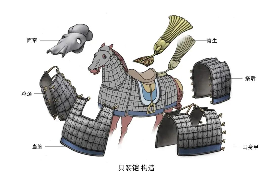晋以后,骑兵保护战马的铠甲多称为“具装”或“具装铠”。据《宋史·仪卫志》:“甲骑具装:甲,人铠也;具装,马铠也。”甲骑具装,即指人和马都披铠甲的重装骑兵。三国时已经出现了比较完备的具装铠,曹操曾提到,“(袁)本初马铠三百具,吾不能十具”(《太平御览》卷三五六引《魏武军策令》)。但在西晋以前,具装铠的使用一直很有限。到了东晋、十六国和南北朝时期,具装铠的使用就非常普遍了,军队中装备的数量达到以千计、以万计,直接导致了重装骑兵成为此时期军队的主力。