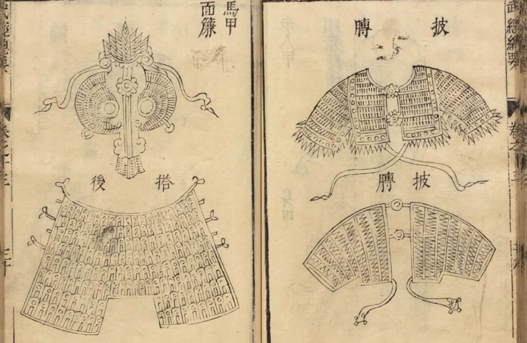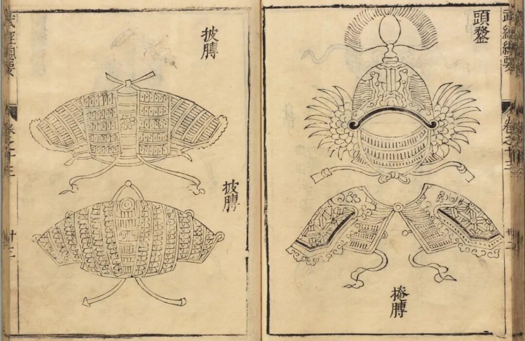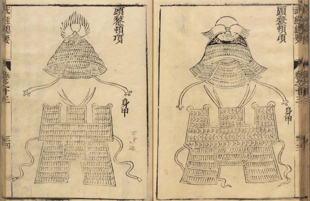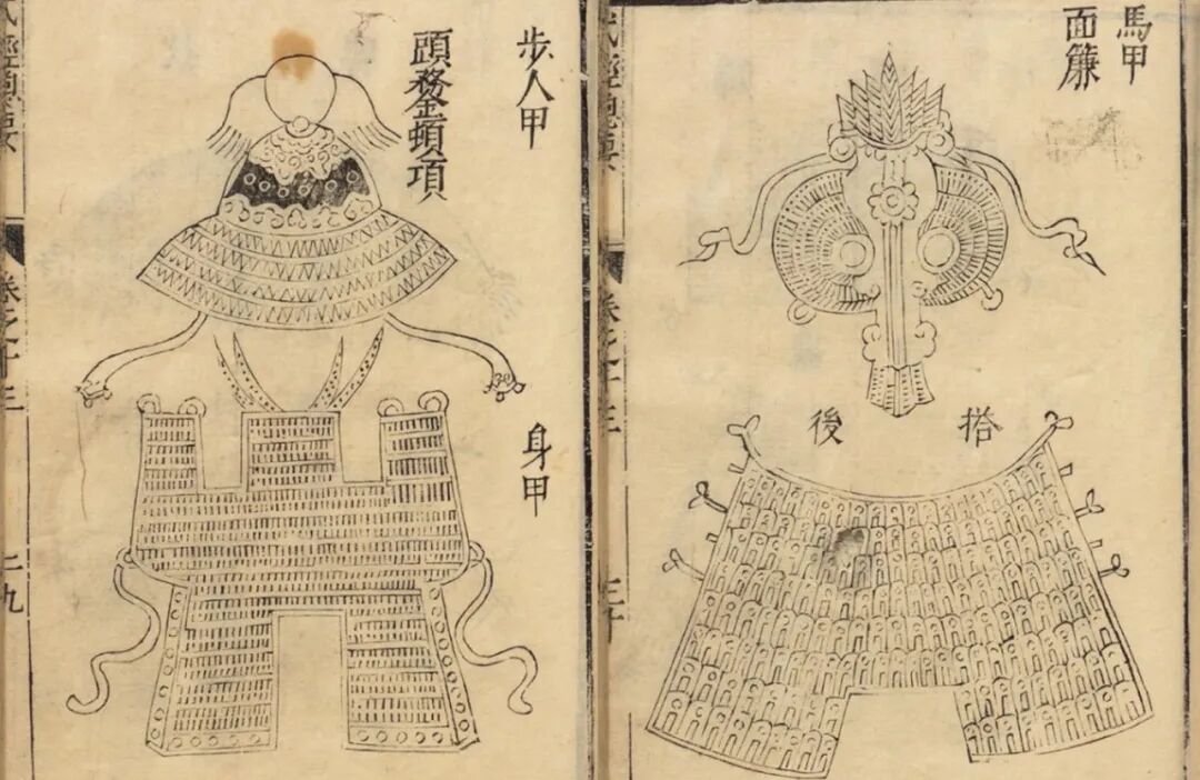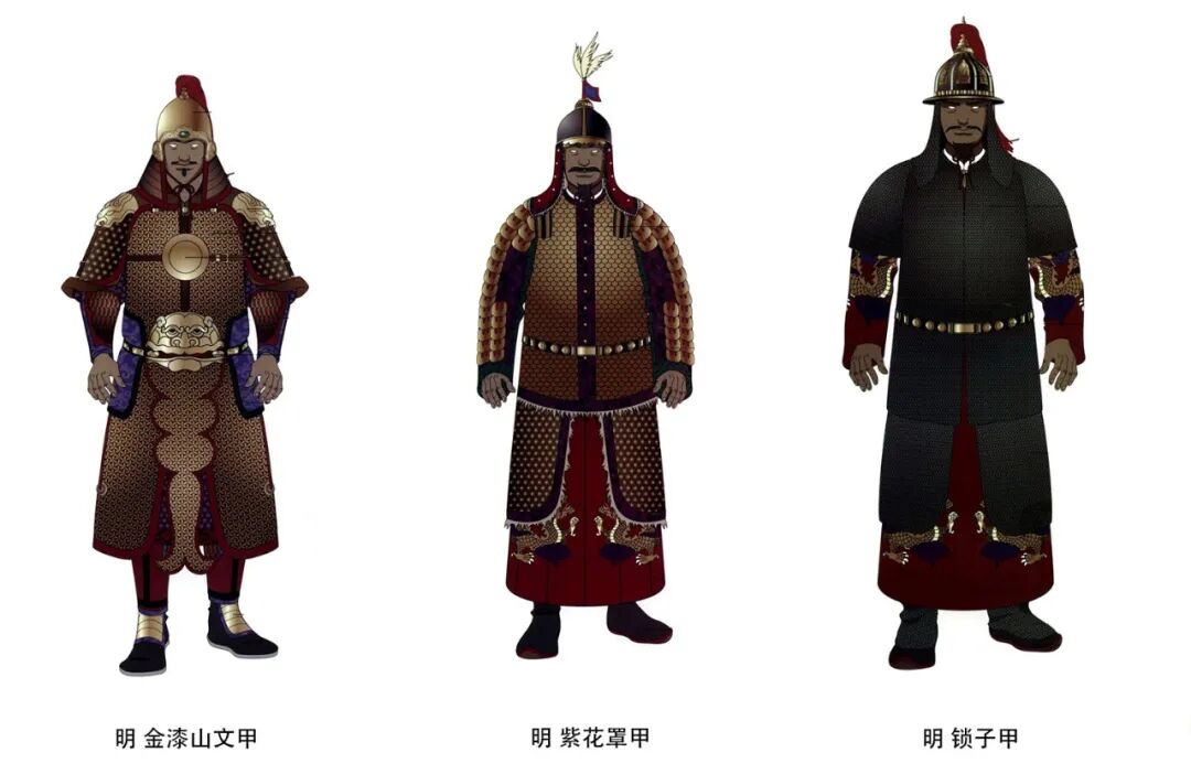 据《明会典》等书的记载,明代甲冑的名目极多,它们是依据制作、形制和色泽的不同而名之。从甲冑的组成部件来看,比宋元甲冑更为完备,护首有盔和顿项,护上身有胸甲、缠腰、臂缚和腕甲,护下身有腿裙、甲裤和甲靴。盔多用钢铁制造,很少用皮革,顶有圆管插放缨、旗、羽等饰物,盔后垂有顿项,或叫围脑。将官所穿的铠甲,也以钢铁为之,甲片的形状,多呈“山”字形。兵士则多穿锁子甲,在腰部以下还配有铁纲裙和铁纲裤,足穿铁纲靴,制作技术较前更为精密。明代亦有绵甲、绢甲、罩甲之制,绵甲、绢甲即以丝绸或棉布为里,上钉缀甲片。《明会典·军器》中记:“弘治九年,令甲面用厚密青白绵布,钉甲用火漆小丁。又定青布铁甲每副用铁四十斤八两。”罩甲是穿在戎衣外面的甲衣,束小带,长短不一,有的具有防护作用,有的只是仪卫穿着起点缀作用。遇有朝贺时,侍卫官俱戴凤翅盔,着锁子甲,武将着红盔青甲、金盔甲、红皮盔线金甲及描银甲等,制作较战时用甲更为精美华丽。