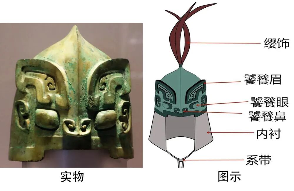 商代的冑已用青铜铸造。在河南安阳侯家庄的一个墓中,出土的青铜冑约141顶。铜冑的形制大体相近,表面有精美的图案纹饰,打磨光滑,但冑的里面粗糙,因此使用时冑内可能有软的织物作衬里。铜冑一般高20厘米以上,2000~3000克。冑体的左右和后部向下伸展,用以保护耳朵和颈部。冑面居中有一条纵伸的脊棱,把全冑均匀地分成两半。不少铜冑正面铸出兽面纹饰,显得颇为威武。在冑顶正中,都有向上竖立的圆管,用来安装缨饰。