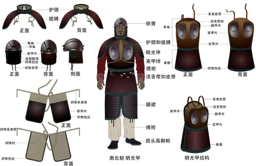 明光铠是南北朝时期又一种重要的铠甲,在三国时期也已经出现。这种铠甲可能因为胸前和背后各有两面大型金属圆护,很象镜子,反照太阳光即发明光,正如汉代镜铭所谓“见日之光,天下大明”,所以称为“明光铠”。明光铠一般颈有盆领,肩覆披膊,腰上束带,个别的还带有腿裙。其在北朝晚期日益流行,表现出取代两当铠的趋势。
