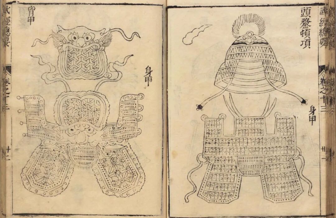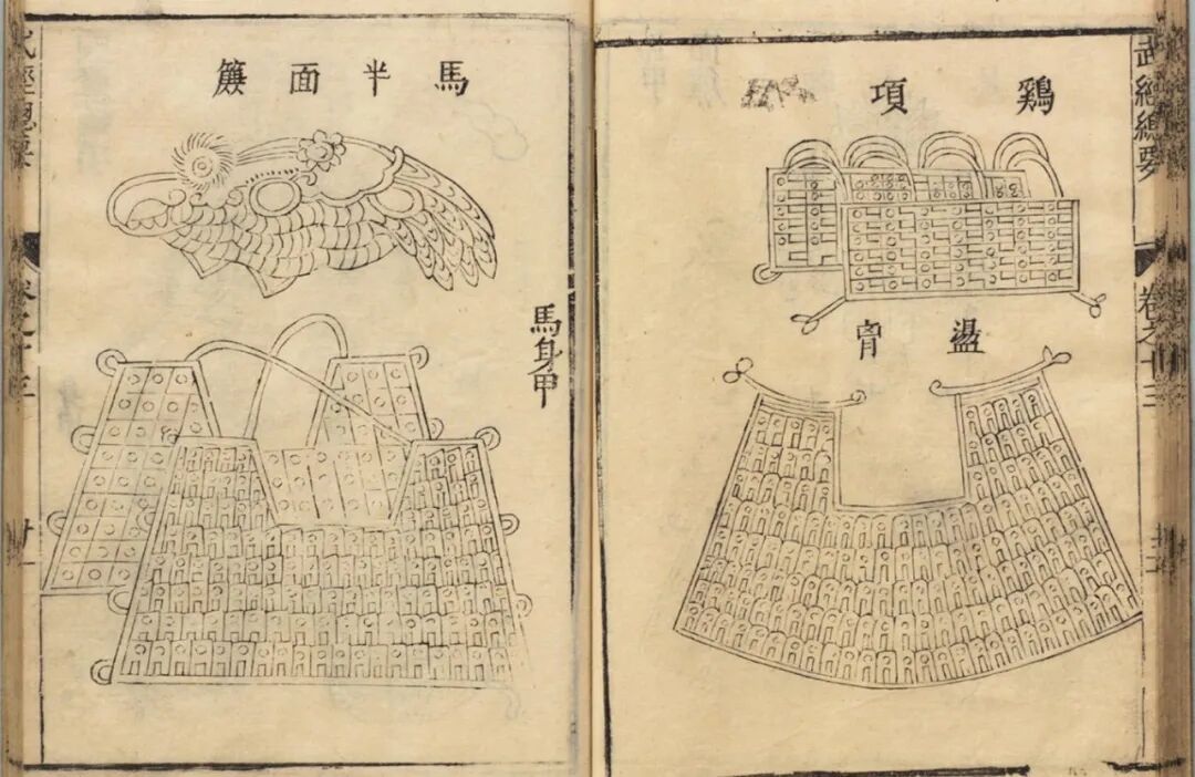 在唐代铠甲的基础上,宋代的甲冑形成了较完整的制度。一般由头鏊、顿项、身甲、披膊、吊腿组成。身甲是一整片,由数列小甲片组成,上面是保护胸背的部分,用带子从肩上系联并从腰部束扎,腰下垂有两片吊腿,身甲上缀披膊,左右两片披膊在颈背后联成一体。头鏊顶部中央插缨,后面垂缀着较长的顿项。盔甲的材质分为铁、皮、纸三等,铁甲最为贵重。据《宋史·兵志》记载,绍兴四年(1134年)颁布四等甲式,甲重45~50斤,所用甲片的叶数是1825片。到南宋中期以后,铠甲的重量有所减轻,但甲叶的数目有所增加,说明铠甲的质量又有所提高,更加精细了。宋代的羌族用冷锻技术制造的瘊子甲尤为精坚,沈括《梦溪笔谈》称:“去之五十步,强弩射之不能入。”