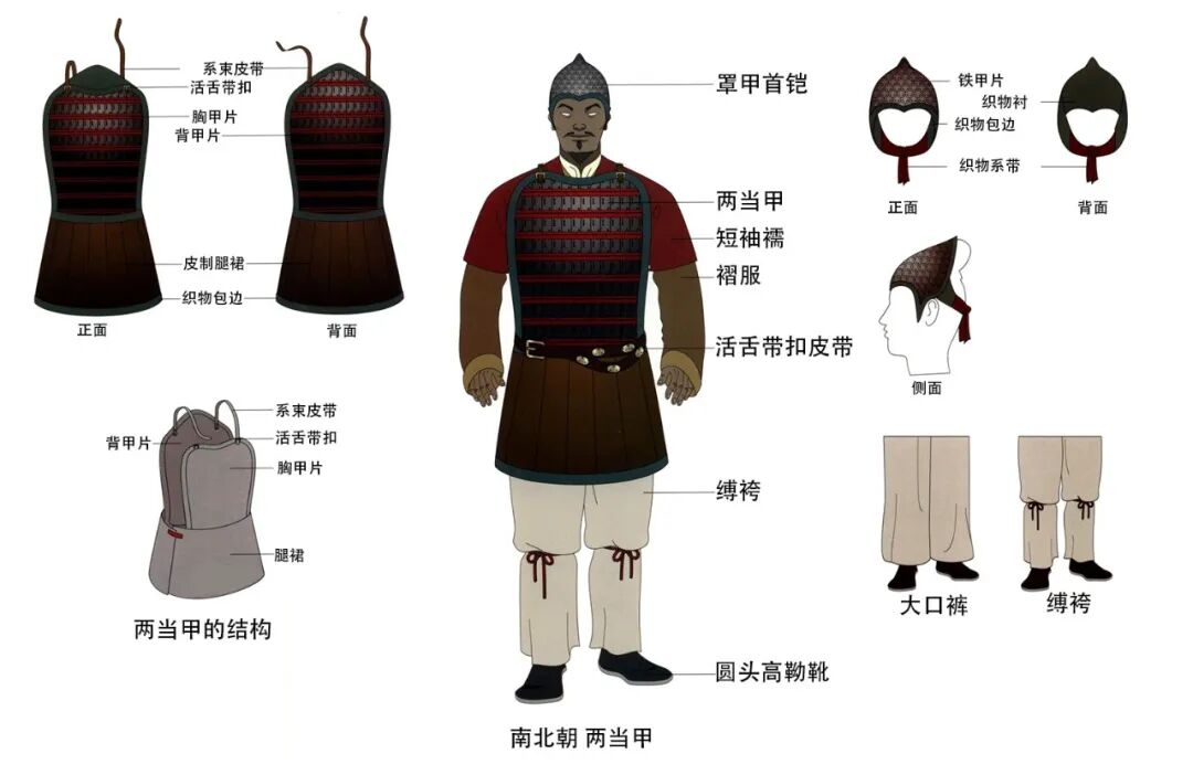 两当铠是南北朝时期最重要的铠甲,之所以叫两当,是因为其形制和服饰中的裲档(裲liǎng,坎肩儿、背心儿的古称)衫相近。《释名》:“裲裆,其一当胸,其一当背也。”两当铠的特征也正是一片当胸,一片当背,在肩上用带将前后两片扣联,腰间以腰带系扎。魏·曹植在《先帝赐臣铠表》中说:“先帝赐臣铠,黑光、明光各一领,两当铠一领,环锁铠一领,马铠一领…。”(《北堂书钞》卷二一引)说明两当铠至迟在三国时期已经出现。