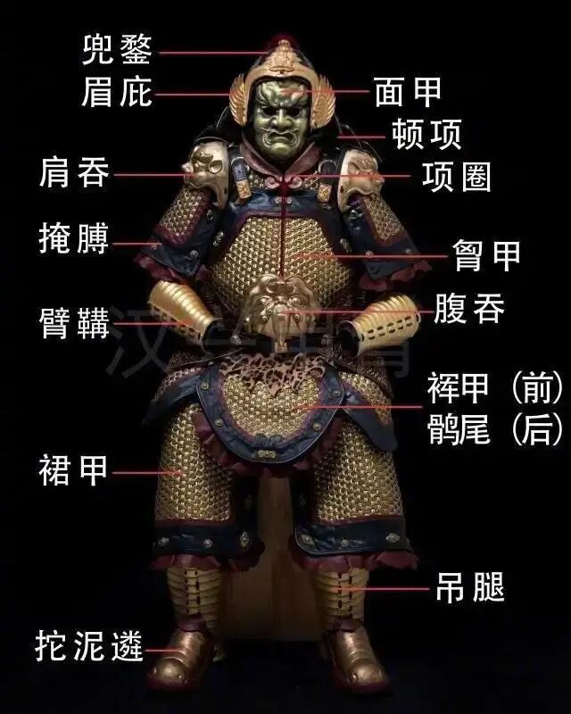 据《唐六典》记载,唐代的铠甲有十三种,“一曰明光甲,二曰光要甲,三曰细鳞甲,四曰山文甲,五曰乌锤甲,六曰白布甲,七曰皂绢甲,八曰布背甲,九曰步兵甲,十曰皮甲,十有一曰木甲,十有二曰锁子甲,十有三曰马甲”。其中明光、光要、细鳞、山文、乌锤、锁子等六种都是铁铠,皮甲以皮革制成,其余白布、皂绢、布背、木甲等都以使用的原料而命名,步兵甲是步兵使用的,马甲即具装铠。两当铠已被淘汰,但两当铠将胸甲和背甲用带在肩上扣联的方法仍有沿用。