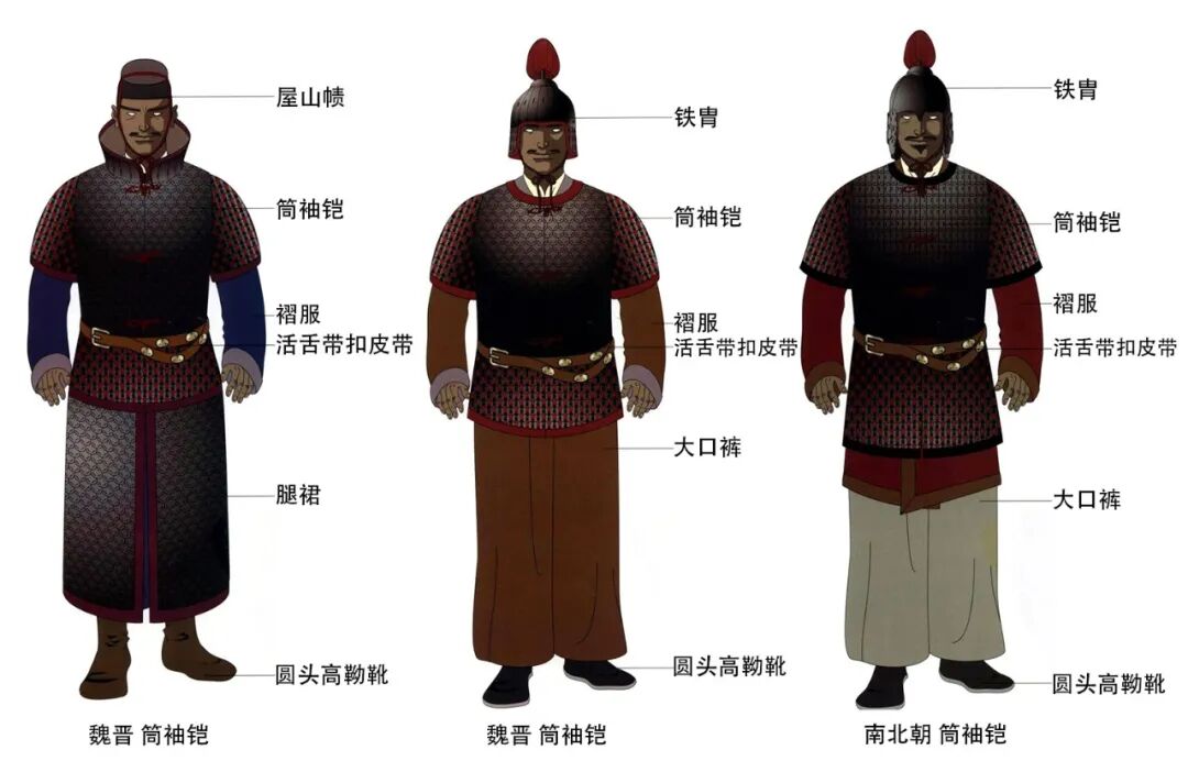 从文献上看,魏晋南北朝时期铁铠和皮甲兼用,同时也使用少量的钢铠。南北朝时,军队中一般军装盛行布质的裤褶。当时重装骑兵是军队主力,普遍都披戴铠甲,而在穿戴两当铠时,都先于里头着穿裤褶;至于步兵则相对不受重视,往往只穿裤褶,于是裤褶也就成为步卒的常用军服。
