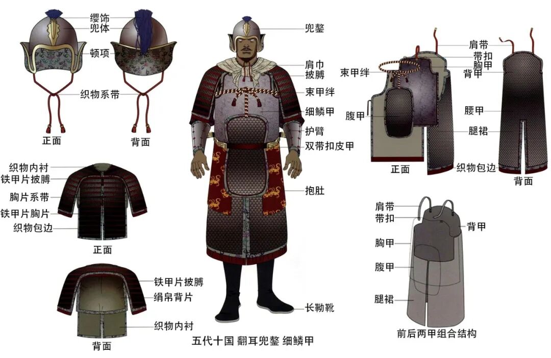 从唐晚期到五代十国,又出现了一种新型铠甲。其身甲分胸背两部分,在肩部用宽带扣联;身甲上分别为长方形甲片、鱼鳞形甲片或是山文甲;肩覆披膊,腰束大带,并在胸部另束一细带;腰带以下则左右各垂一片膝裙。兜鏊有两种,一种护耳上卷,一种后缀顿项。五代十国时期,全国各地的甲冑比较统一,主要都是此种型式,反映了甲冑发展的规范化。