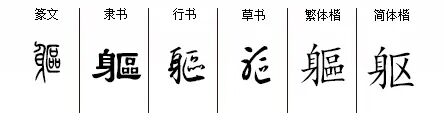 “躯”qū,形声字,‘軀’的简体字,从身从區。‘軀’字目前最早见于《说文》小篆。身,与身体有关;區,众物储藏于容器。造字本义:身之容器。