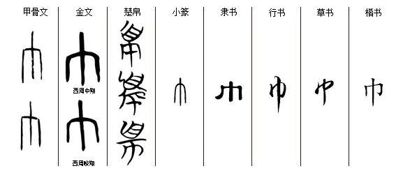 巾jīn,象形字,‘巾’字目前最早见于商代甲骨文。目前发现最早的丝绸织品为距今约5300年(大汶口文化时期),商朝距今约3600年,甲骨文是根据事物、行为等因素长期形成的,据此可推测,‘巾’字约创造于此区间。甲骨文的‘巾’字形似束发的‘丝、麻’带披于脑后,介于‘麻’属于植物,无法长期保存,无法盖棺定论之。西周时期的‘巾’字沿用商朝甲骨文。楚系简帛的‘巾’字从頁从巾,‘頁’的本义为‘头部’,也进一步强调了‘巾’与头部有关。《说文》小篆、楷书沿用西周‘巾’字。造字本义:用作束发的丝、麻带,多指矩形的丝麻制品。