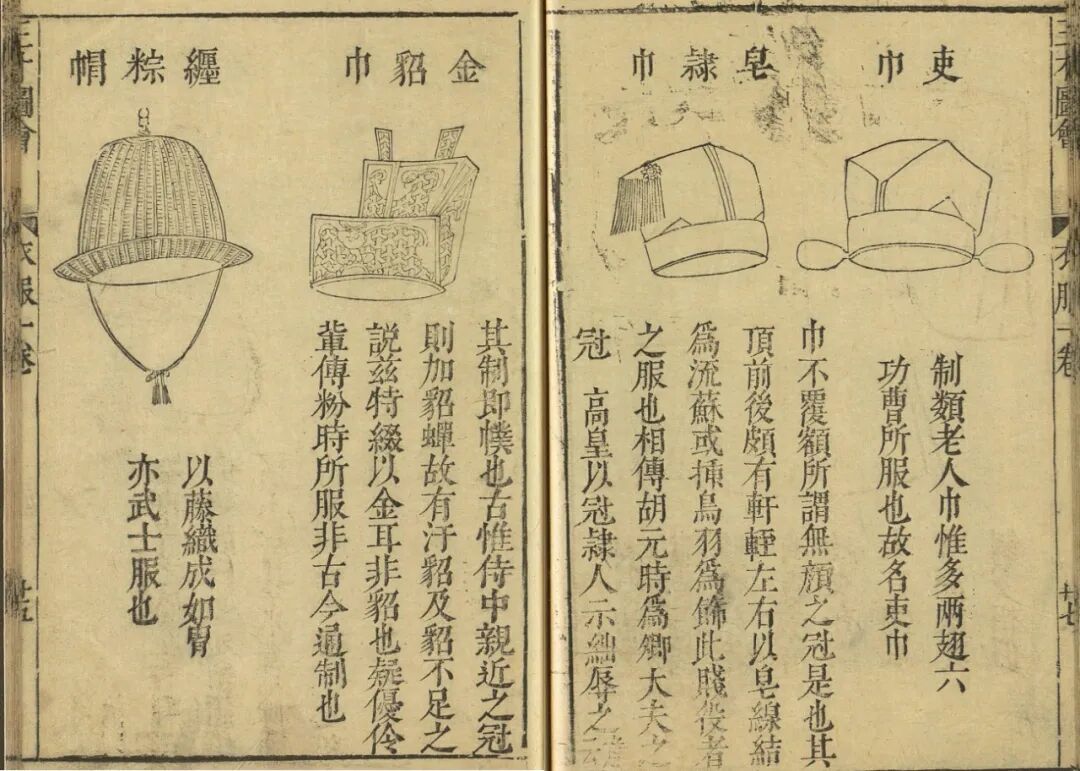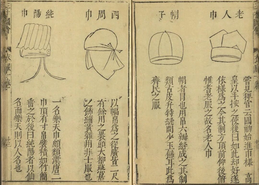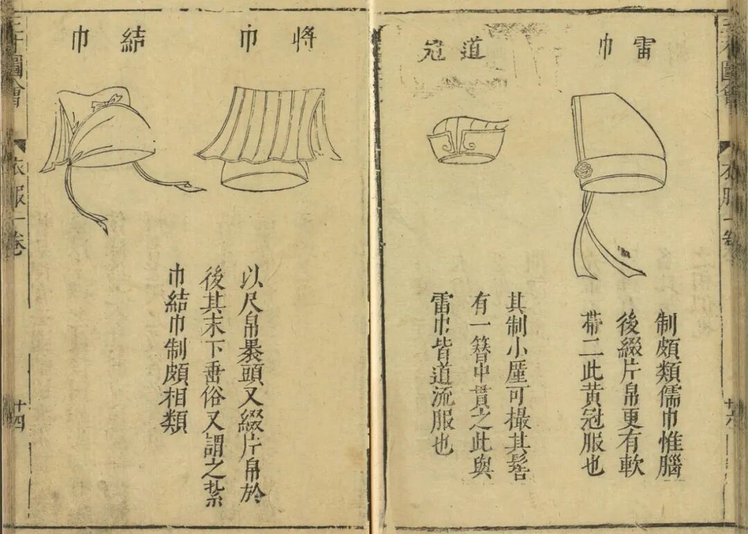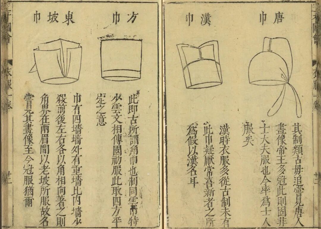最初的头巾为方帕,每次使用时都要临时系裹,后来出现了事先被折叠缝制成各种形状的巾,用时直接戴在头上,非常方便。东汉时出现的角巾就属于这种形制。