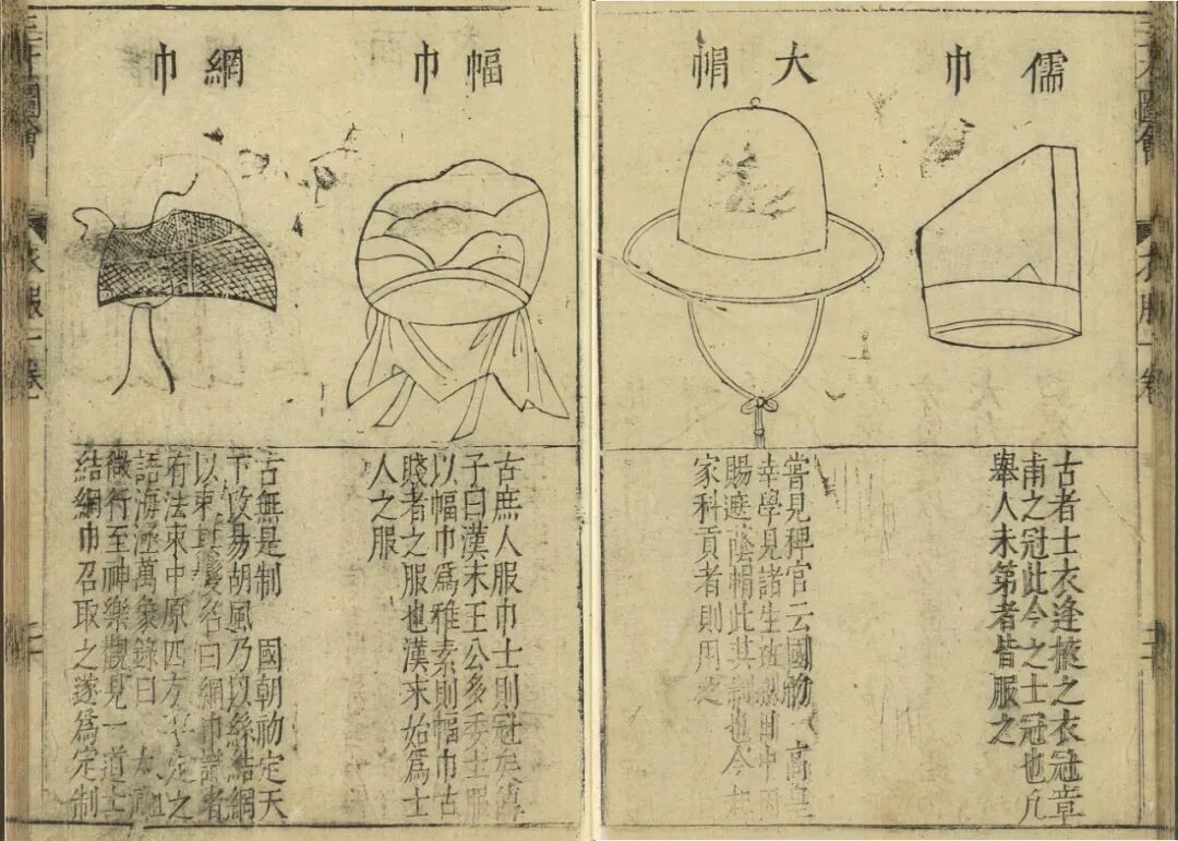 明代儒士、士人常戴的一种头巾,据明代王圻《三才图会)记载:“儒巾,古者士衣逢掖之衣,冠章甫之冠,此今之士冠也。凡举人未第者皆服之。”儒巾以漆藤丝或麻布为里,黑绉纱为表。帽围呈圆形,巾身由四片布帛缝制而成,顶部四角隆起,呈方形,后有两条垂带。