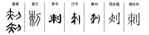 “刺”cì,形声字,也作‘㓨’,从朿从刂,‘刺’字目前最早见于秦系简牍。汉代碑书文字写作‘㓨’或‘刾’,是讹‘朿’为‘夾(夹)’的结果。朿,苗木的环绕刺;刂,与刀有关。造字本义:尖锐物如刀般锋利,泛指尖利如针之物。