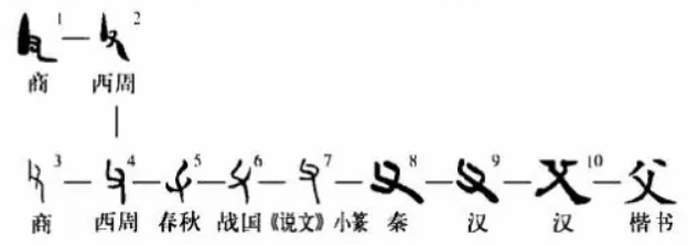 《说文》:“父,矩也。家长率教者。从又举杖。”《说文》认为“父”是以手举杖的形象,表示行使责打教育权力的家长。若此说不误,“父”与“攴”就是同源,举杖的人是“父”,举杖责打的行为就是“攴(扑)”,所谓“鞭扑不可废于家刑”。所见“教”与“斆(学)”都从“攴”,都透露出古代父亲、鞭扑、教育之间的关系。但商周更为象形的金文“父”字手所举的不像“杖”。郭沫若说像手拿着斧子的形象。若此,“父”与“斧”就是同源,是以手持斧表示从事此类劳作的家庭劳动力。从字形看,此说更为合理。“父”字究竟是以手持杖的教育者,还是以手持斧的劳作者现在还无法定论,但它的基本意义“父亲”古今是一致的。从商代至今,它一直是个常用字。