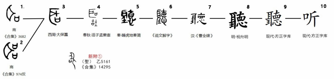 “听”,会意字,聼的简体字。在甲骨文和金文中写作咡或𦔻,属甲骨文字形由“耳”和“口”组成。“耳”,是人的听觉器官。“口”,是人的发音器官,两者结合,表示口说话,耳朵听,本义是听到声音。甲骨文有从一“口”的,也有从二“口”的。西周金文构型与甲骨文相同,但耳朵已经变样。在图4的金文中,下部增加了两个构件,右边是“生”字,左边是“古”字。根据铭文“听命于天子”推测,可以确定是“听”字,义为听从。其构型含义可能为听到了发生在古代的故事。到战国竹简中,“听”字又一次繁化,然后演变为繁体字形(甲组图9)。