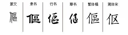 “伛”yǔ,形声字,‘傴’的简体字,从亻區声,‘傴’字目前最早见于《说文》小篆。亻,与人有关;區,众物储藏于容器。于人而言的储藏容器即指身躯,然已有‘躯’表义人体,在人体之上的储藏容器应是对身体增生部分的抽象描述。与‘佗’的‘驼背’义相比,‘伛’描述的是身体的增生;‘佗’描述的是人形体上的弯曲。字义在不纠结实质下可以互通。造字本义:身体的增生,多用于面部、背部的畸形,如‘伛兜’(凹陷)、‘伛背’(驼背)等。