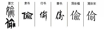 “偷”tōu,形声字,也作‘偸、媮’,《说文》并未收录‘偷’字,‘媮’字目前最早见于《说文》小篆。从人俞声,人,与人有关;俞,织布梭子,此处引用‘沿着某种轨迹传输’的引申义。两形会意,即指‘人为的将某物沿着某种轨迹运送’。造字本义:人为的将某物沿着某种轨迹运送,引申为‘窃取’,如‘偷钱、偷东西’等;引申为‘抽出、挪出’,如‘偷空、偷闲’等;引申为‘私下的’,如‘偷听、偷看’等。