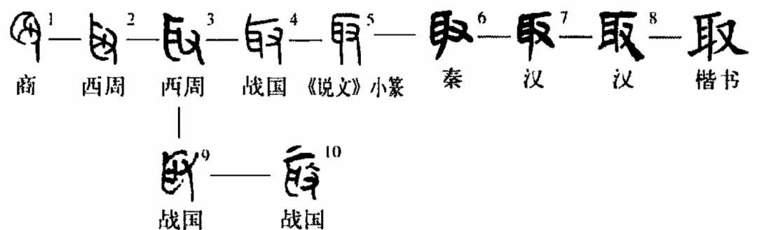 会意字,甲骨文(图1)的“取”字像是一只右手拿着一只左耳的形状。《周礼·夏官·大司马》里便这么一段记载:“大兽公之,小禽私之,获者取左耳。”郑玄注:“得禽兽者取左耳。”大意是说捕获禽兽以后要割下其左耳记功。古代战争俘获或杀死敌人后,也会把战俘或被杀死的敌人的左耳割下拿回来作证,视割耳数量的多寡而计功记功。这一行为也叫做“聝”,也是“取”的造字本意。这个字发展到西周金文时,耳朵已经变样,小篆再次变化。从构型上讲古今一脉相承,变化不大。楚文字中虽然有上加横划饰笔和变“又”为“攴”的异体(图10),但都符合其自身演变的规律,较之省讹形体,变化也不算很大。