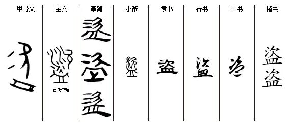 “盗”dào,会意字,同‘盜’,‘盗’字最早见于商代甲骨文。甲骨文的‘盗’字为上下结构,上部为‘次’、下部为‘舟’。为什么下部为‘舟’呢?甲骨文中的‘舟、俞、凡’相似,‘俞’字虽然为合体字,但从西周早期开始造字者就将其以独体字的形式进行形声字的创造,如‘愈、逾’等;而由‘舟’字衍生出来的形声字则以舟船为主,如‘船、舱’等。‘舟、俞’皆有‘将物体运送’的引申义。但‘盗’字为商代或商代以前所造,而由‘俞’所衍生的形声字始于西周早期,因此‘盗’的下部应为‘舟’,而非‘俞’的简省。次,反复的、跟风的;舟,引申为‘将物体运送’,两形会意,即指‘不止一次地将物体运送’,引申为‘屡次偷东西’。商晚期到春秋早期的‘盗’字尚未发现,但从春秋早期「秦公鎛bó」铭文中的‘盜’字可知,此时的‘盜’字已经发生形变,或为西周时期新造字,从㳄xián从皿。㳄,口水;皿,器皿,两形会意,即指‘看到人家的器皿就会贪婪地流口水’,引申为‘因贪婪而妄图占有’。甲骨文的‘盗’字,无论从造字所使用的字根还是字义的引申,都比春秋时期的‘盜’字更为精妙。然而,这就是历史,只能接受。秦系简牍和《说文》小篆沿用春秋时期的‘盜’字。造字本义:不止一次地将物体运送,引申为‘屡次偷窃、因贪婪而妄图占有’等。