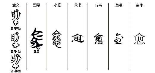 “愈”yù,形声字,通‘瘉、癒’,‘愈’字目前最早见于春秋早期「鲁伯愈父鬲」。与战国中期的楚系简帛(郭店竹简)结构相同,皆为上俞下心。鉴于后造字‘愉’与‘愈’皆使用相同字根,且最早都出现在《诗经》,唯有发声上的差异。这里不提上古四声,就单说人在表达心理活动时的声调变化。一声平、二声扬、三声转、四声降,‘愉’yú的二声与‘愈’yù的四声,在程度上有着区别,如‘欲扬先抑’一词即把二声与四声的情境描述地很好;再如‘凉、冷、冻’三个程度上的区别也借着二三四声描述地很好。汉字中这种因程度递进的音调变化比比皆是。因此,‘愉’所表达的‘心越来越…’与‘愈’所表达的‘心越来越…’有着程度上的变化,‘心情’与‘内心’皆为‘心’引申出来的抽象义,从程度上、文献中直接或间接地印证了二者语意上的区别。这也侧面证明了‘愈’通‘瘉、癒’,即‘病情’和‘内心’需要更多的时间发生变化,而‘心情’次之。俞,织布梭子,此处引用‘越来越、逐渐’的引申义;心,心脏,此处引用‘内心’的引申义。造字本义:内心越来越…,常用作副词‘越来越、逐渐’。