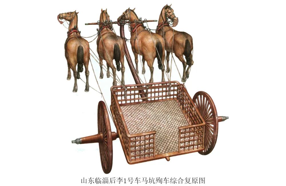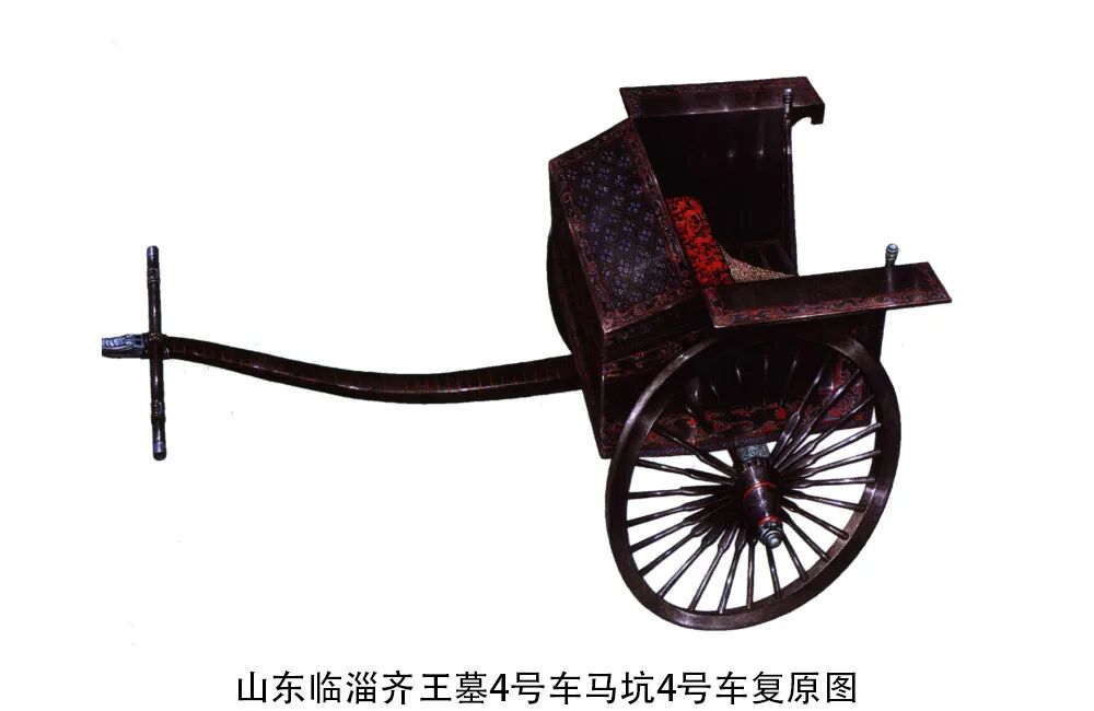 1978年在山东淄博市临淄区大武乡齐故城遗址附近发掘出西汉齐王墓,内置四辆车13匹马,三辆大型车排列在墓内东南的4号车马坑的西端,1辆小型车单独置于坑东端。大车都已朽毁,地面仅能辨别出最上层的伞盖痕迹,轮舆等大部分结构已无法清理,只能从散落的铜饰和漆皮大致确定车的轮、衡、辀的位置,只有4号车因车舆厢板是以木条与藤条编织的方格网做底,外面涂抹类似谷糠、骨末和白灰状物质混合成的泥子,再贴附麻布,并加以髹漆的缘故,所以没有朽坏,出土时依然立于坑内。这辆车车身低矮,车型小,独,车衡很短,也不见车轭,车厢的前半部设有车座,车舆外侧和车耳顶面用红、白、绿、蓝四色彩绘,车辆上也绘有38道红色带纹,装饰华丽,疑是又一辆用人驾挽的辇车(图 山东临淄齐王墓4号车马坑4号车复原图)。齐王墓墓主为刘襄,葬于汉文帝元年,这座墓在西汉诸侯墓中年代最早。