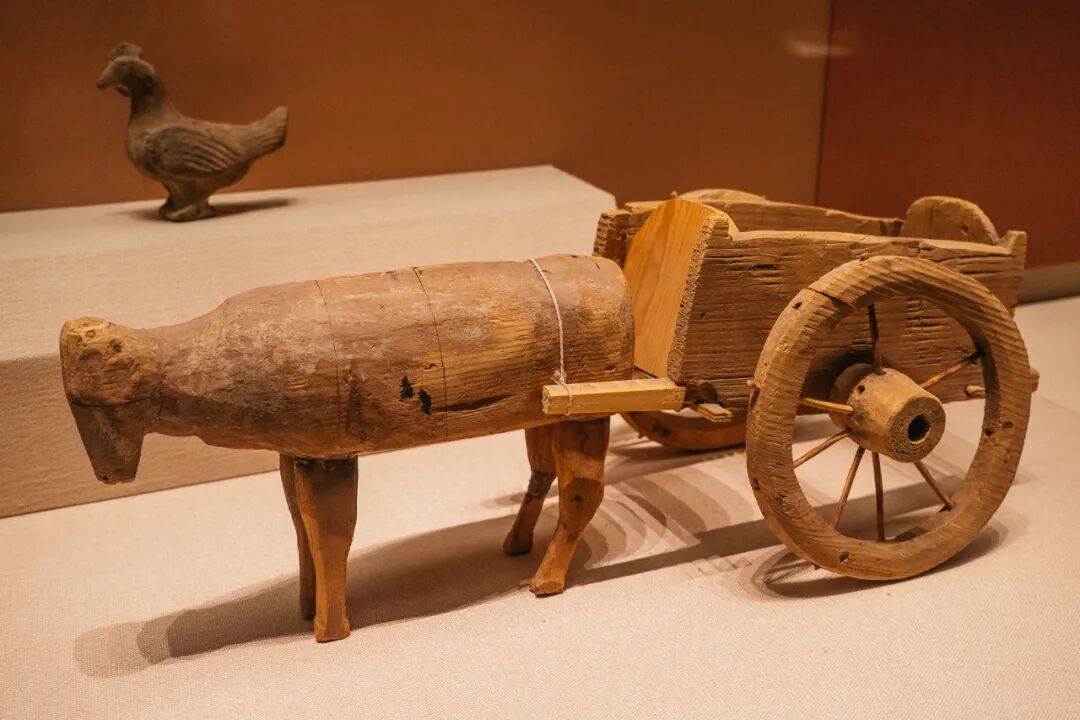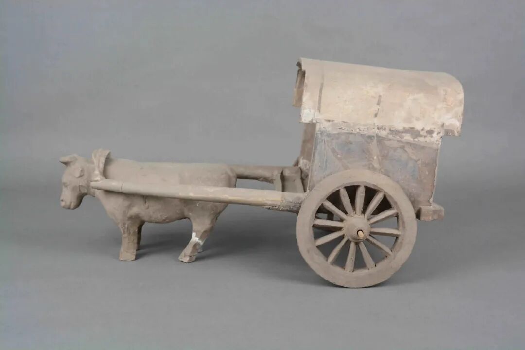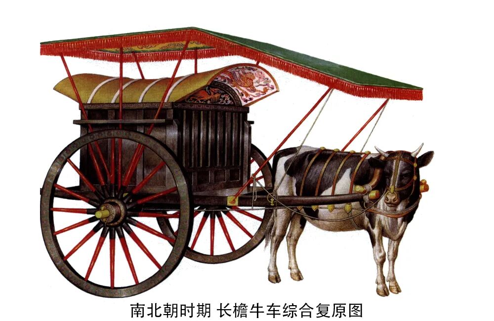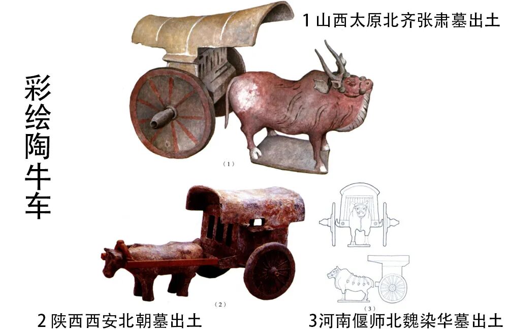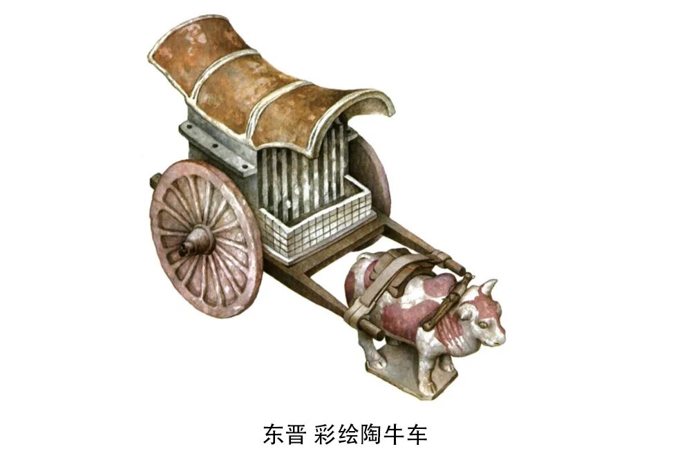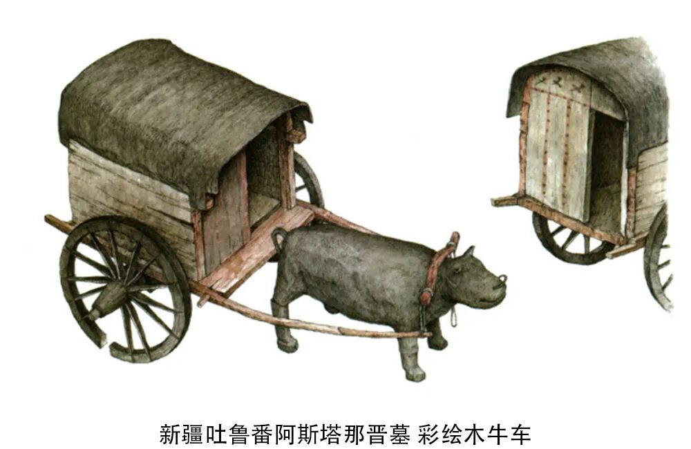晋代的牛车从墓室壁画中只能看出大致的轮廓。比较真实地再现其形象的是新疆吐鲁番阿斯塔那晋墓出土的木牛车模型(新疆吐鲁番阿斯塔那晋墓 彩绘木牛车)。