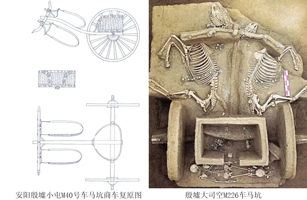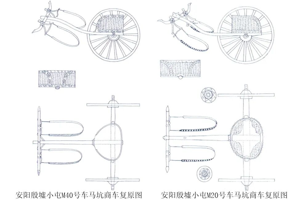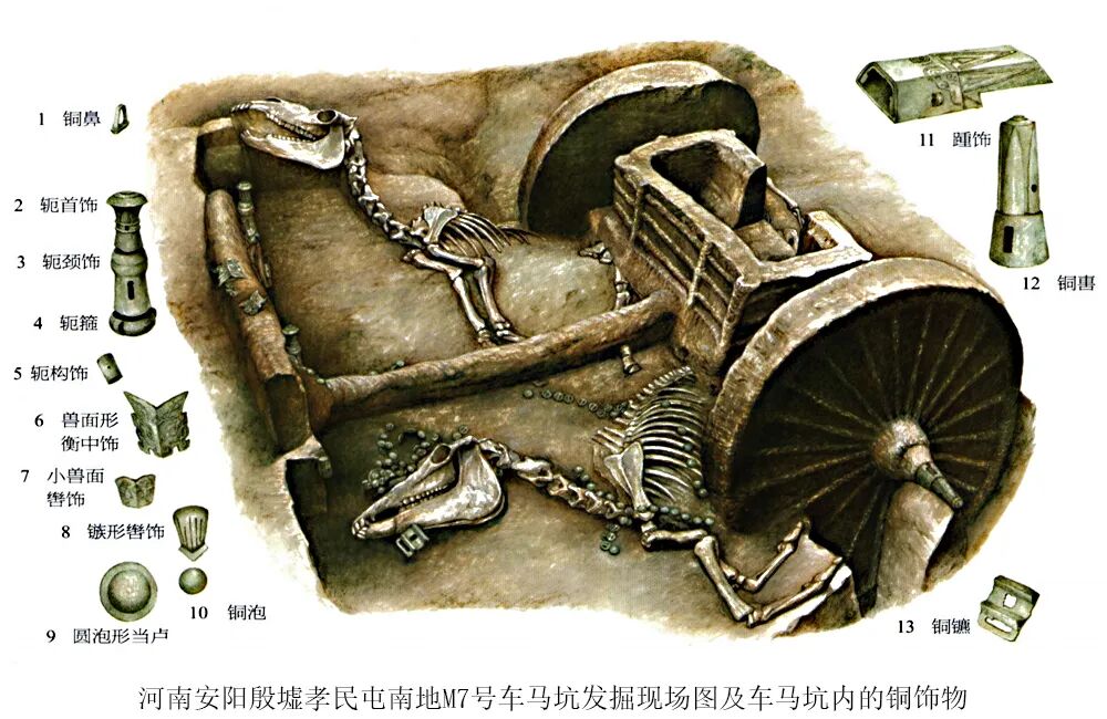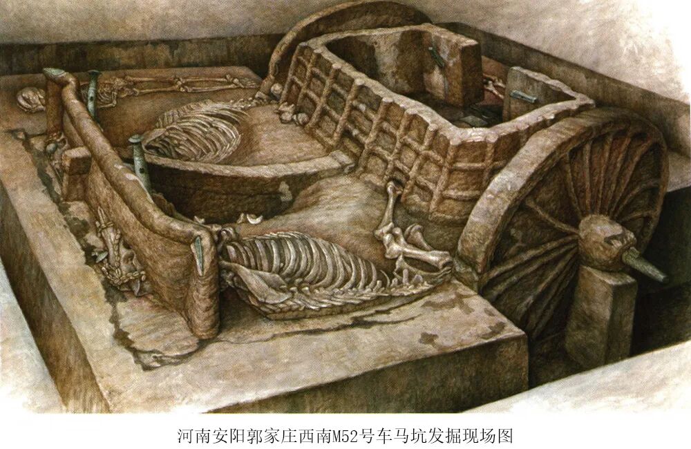 1972年在安阳殷墟孝民屯南地发掘的编号为M7的车马坑,坑内埋了一车二马一人,马在车辀(zhōu,车辕)的两侧,马顺同一方向而卧,人压在车舆后部两轮之间。木车的车厢由底板、立柱和横杆组成,车轴由于泥土堆压已成直木,车衡也是圆径直木,所有车上的铜饰物和马具都处于原位,没有遭受任何破坏,这辆车的出土总算使人们了解到商代车的整体面貌。继其后,1981年、1987年在安阳殷墟和郭家庄又十分完好地发掘出编号为M1613、M52的两座车马坑。M1613内埋了一车二马,M52内埋了一车二马一人,这两辆车都是大型车厢,全部遗迹不仅完整,而且很少变形。尤其是M52号车,车舆周围还留有大片漆皮,漆皮上还能分辨出彩绘纹饰,舆前的织物痕迹上还粘有牙饰件,为研究复原提供了宝贵的形象资料。这两座车马坑都被安全地搬迁至室内并妥善地保存下来。