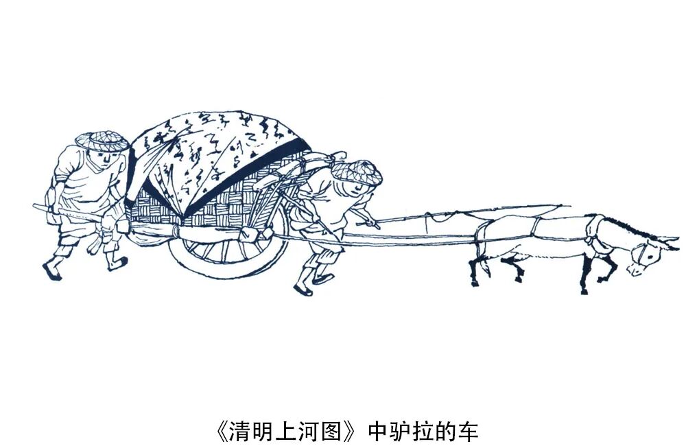 北宋的驴车虽然不正统,但驴拉车的方法很值得研究。拉车时用的不是轭或鬲,而是在脖子上套了一个有充填物的布轭套,拉车的绳就系在轭套上,这种软质布轭套称为“肩套”,是双辕车最完善的鞍套式系驾法开始出现的标志。