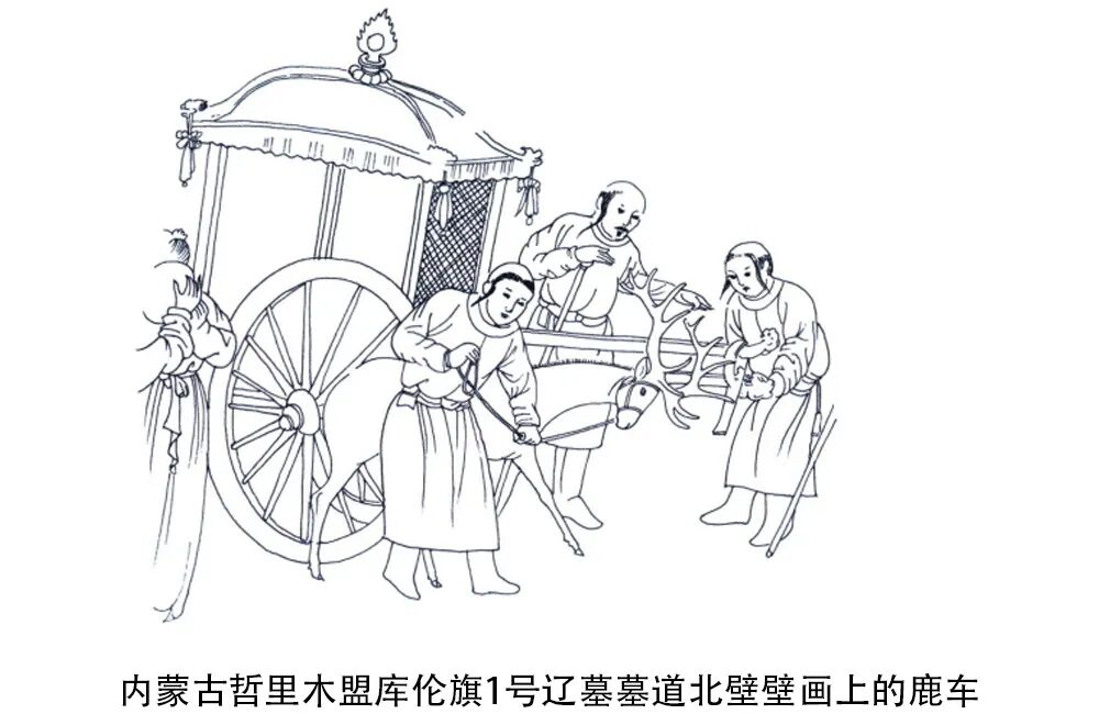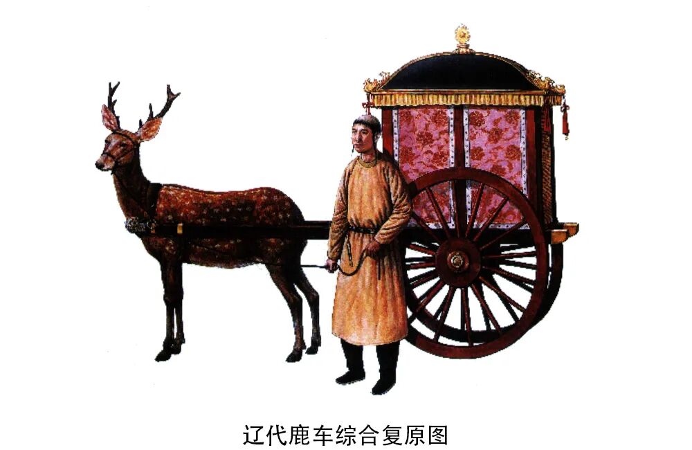 辽朝还有用鹿驾车的。内蒙古哲里木盟库伦旗辽墓的墓道北壁壁画上有一辆小车,车厢的外形与仇英画的驼车后车厢很相似,车盖像轿顶,盖顶中心饰有火珠,车盖周围檐下垂有短帷,四角挂有流苏。门在车厢前面,门上垂挂网格帘,高轮直辕,辕首有辕饰。据《辽史·仪卫志》记载:“契丹故俗,便于鞍马。随水草迁徙,则有毡车,任载有大车,妇人乘马,亦有小车,富贵者加之华饰。”这辆车可能就是妇女乘的有华饰的小车。车前有三人,一人牵牡鹿令其低头,另一人抬车辕正准备架在牡鹿上,双辕上也搁了一条类似于驼车上的宽带,车旁还有一老者似在指点。
