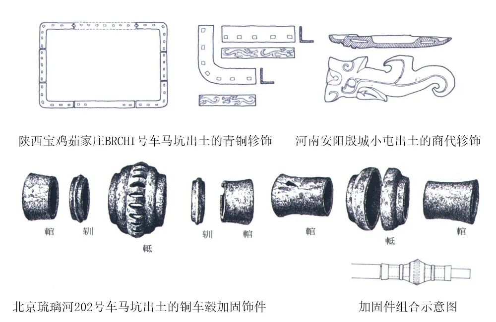 西周车最突出的变化是车上的青铜零件明显增多,制作也更为精美。首先,在车厢上,茹家庄BRCH1号车马坑出土了一组青铜轸(zhěn,车箱底部四周的横木)饰,是安装在舆底框四周轸木上的,这种轸饰在安阳小屯也出土过,但后者是单片型的,而前者则组成一个直角方盘,正好包裹在轸木外;其次,是对车毂的加固。