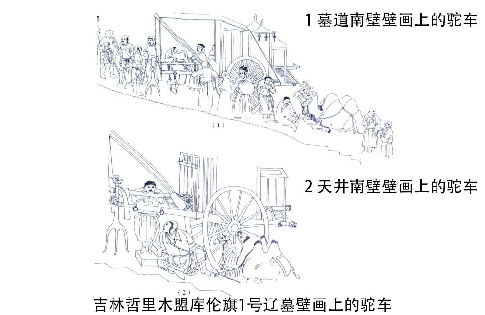 国舆中大部分是驼车,如“总纛车驾以御驼。(纛,dào,古代用毛羽做的舞具或帝王车舆上的饰物)《祭山仪》见皇太后升总纛车。……青帏车,二螭头(螭,chī,古代传说中没有角的龙。古代建筑或工艺品上常用它的形状做装饰。),盖部皆饰以银,驾用驼,公主下嫁以赐之。”驼车的形象在吉林、内蒙古等地几座规模巨大的辽代贵族墓的壁画上曾反复出现,如内蒙古哲里木盟库伦旗1号辽墓的墓道南壁与天井(墓门与墓道之间的空地)南壁两处都绘有驼车,天井南壁的驼车顶部因颜色剥落有些残缺,墓道南壁的驼车较为完整。从图上看,驼车像高轮平板大车,车后有宽阔的车