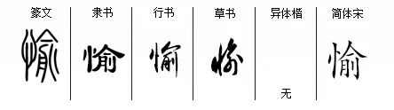 愉”yú,形声字,从心俞声,‘愉’字目前最早见于战国前中期竹简版《诗经·唐风·山有枢》:“他人是愉。”。初步统计,郭店简、上博简和清华简中的‘心旁字’约有250个,其中见于《说文》(包括正篆、古文、籀文、或体字等)的‘心旁字’约有50个。依据高明的《古文字类编》(增订本)分析,该书共收录‘心旁字’198字。从年代上看,殷商甲骨文中‘心旁字’有11字;西周、春秋时期的金文中‘心旁字’有40字;战国各类文献中‘心旁字’有189字。从字的增量上看,高明的《古文字类编》(增订本)所收录的战国‘心旁字’189字中,见于可确定的楚国文献的有118字;118字见于郭店简、上博简和清华简的有105字;105字中仅见于郭店简、上博简和清华简而不见于其他楚简的有51字。由此可见,战国时期所有‘心旁字’中,楚系‘心旁字’的数量超过其他各系文字的总和,而郭店简、上博简和清华简又是‘心旁字’集中出现的三类出土文献。足见,战国前中期楚地创造了很多描述心理状态、内心活动的‘心旁字’。与战国前甲骨文、金文和之后的《说文》中的‘心旁字’形成强烈的对比,也与同时代的秦系文字形成相差悬殊的鲜明对照。秦始皇统一文字以后,战国前中期楚国后造的约250个‘心旁字’已删至约50个(或秦人不承认这些后造字,而多沿用西周、春秋时期所遗留下来的40个‘心旁字’)。战国前中期楚国创造的‘心旁字’均为上下结构,虽然秦简中已有‘忄旁字’,但数量不多。所以‘愉’字的最早的创造时间应为秦汉,而楚国竹简记录的《诗经》中的‘愉’写作‘愈’。