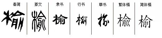 “榆”yú,形声字,从木俞声,‘榆’字目前最早见于秦系简牍,但《管子》一书中曾记载道:“五沃之土,其榆条长”,因此,推测‘榆’字创造时间不晚于春秋晚期。榆树是中国本土故有的树种,根据植物化石资料显示,榆树是新生代第三纪地层的古老树种之一,历史极为悠久。根据目前现有资料考证,很难确定我国裁种榆树的准确时间,但不会晚于春秋晚期。木,与树有关;俞,织布梭子,此处引用‘愈’的‘治愈’义。两形会意,即指一种拥有强大愈伤能力的树,因受某种刺激,在榆树的内部组织积郁,树皮增殖,慢慢隆起变成一个疙瘩,即‘榆树疙瘩’。受伤后,丰富的养分能加快愈合速度,大概半年以上的愈合期,榆树就能正常生长了。造字本义:一种拥有强大自愈能力的树,特指‘榆树’,系根据‘榆树’所造的专用字。