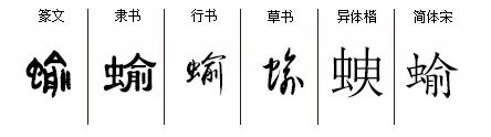 “蝓”yú,形声字,从虫俞声,‘蝓’字目前最早见于《说文》小篆。虫,与虫有关;俞,织布梭子。两形会意,即指一种侧身有孔、形似织布梭子的软体动物,系根据‘蛞蝓’所造的专用字;‘蛞’即指像舌头形状、表面湿润的虫子,‘蛞蝓’这种词汇属于非双声连绵词,虽然拆开后都有各自独立的字义,但有些特指的名词一般不拆开使用。造字本义:一种侧身有孔形似织布梭子的软体动物。