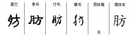 “肪”fáng,形声字,从月(肉)方声,‘肪’字目前最早见于《说文》小篆。月,肉的简省,与动物身体组成部分有关;方,人的周围,此处引用‘多向’的引申义。造字本义:向外生长的肉组织,特指肥肉(白肉)部分。